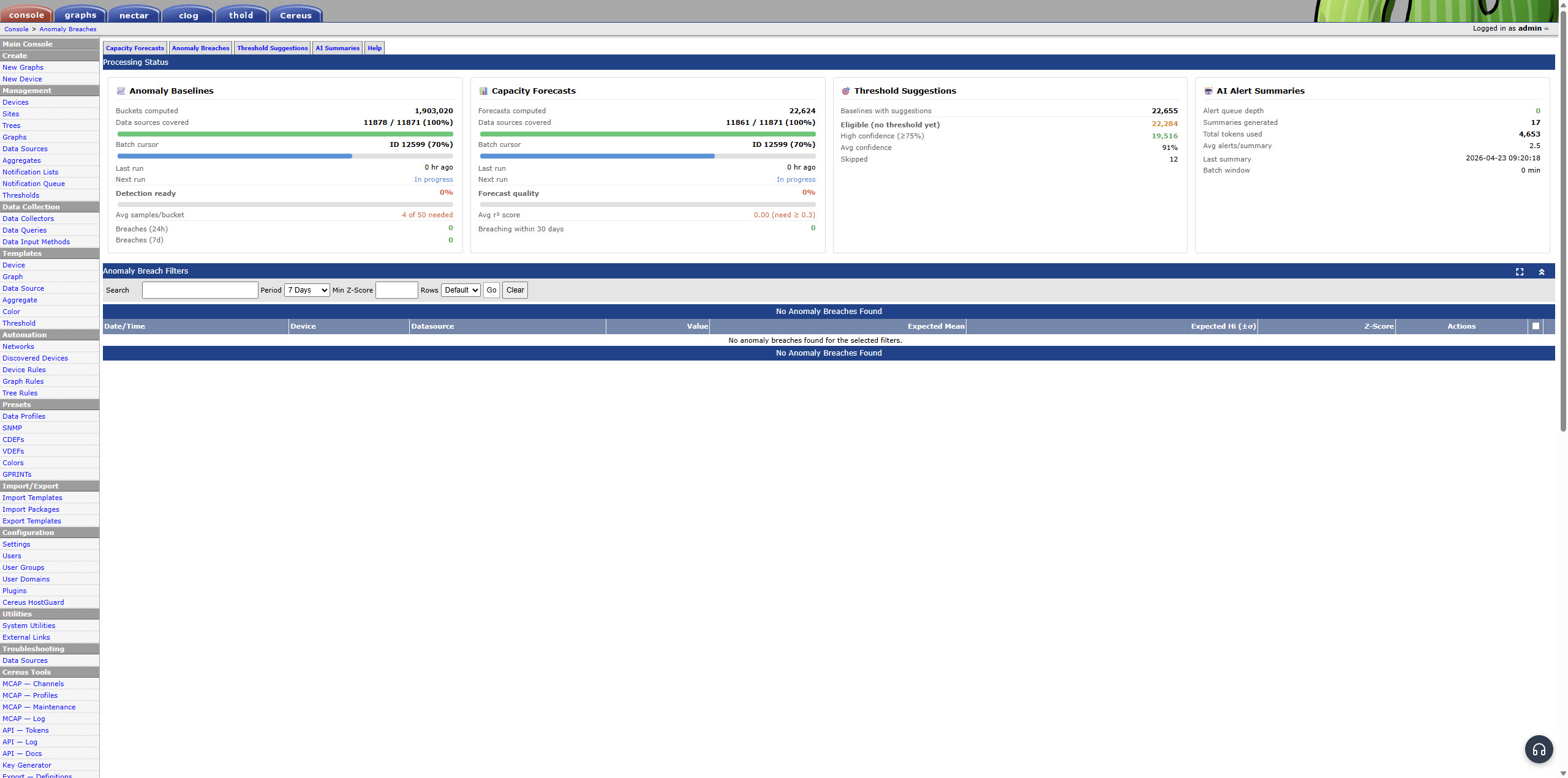 Thold tells you when a threshold is crossed. Cereus Insights tells you when something is unusual — even when no threshold fires. Seasonality-aware anomaly detection, per-datasource capacity forecasting, and AI-generated alert summaries. No per-device configuration required.