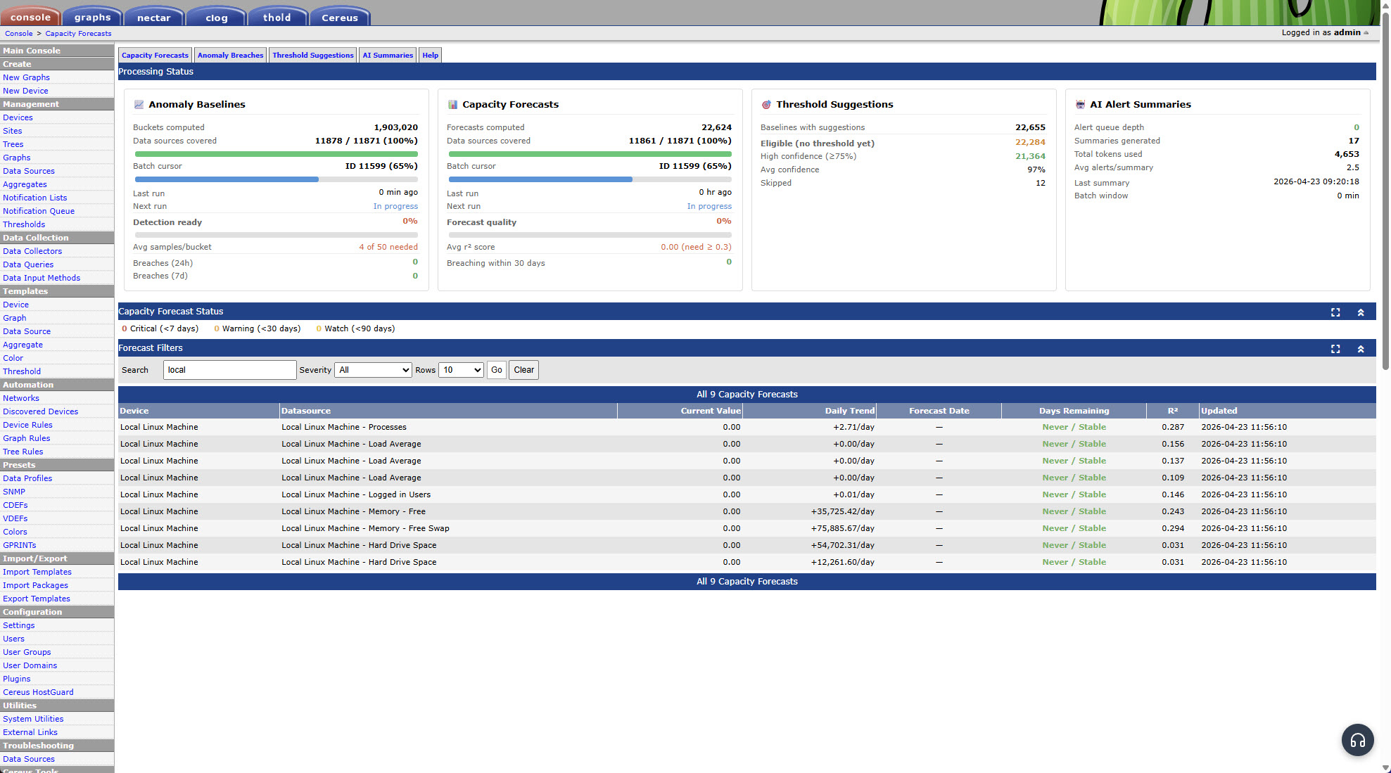 Yes. Capacity forecasting reads directly from RRD files and uses Thold’s thold_hi value as the saturation target if available. Without Thold, forecasts still show trend slope and R² confidence — the saturation date column is simply blank for datasources without a configured threshold.