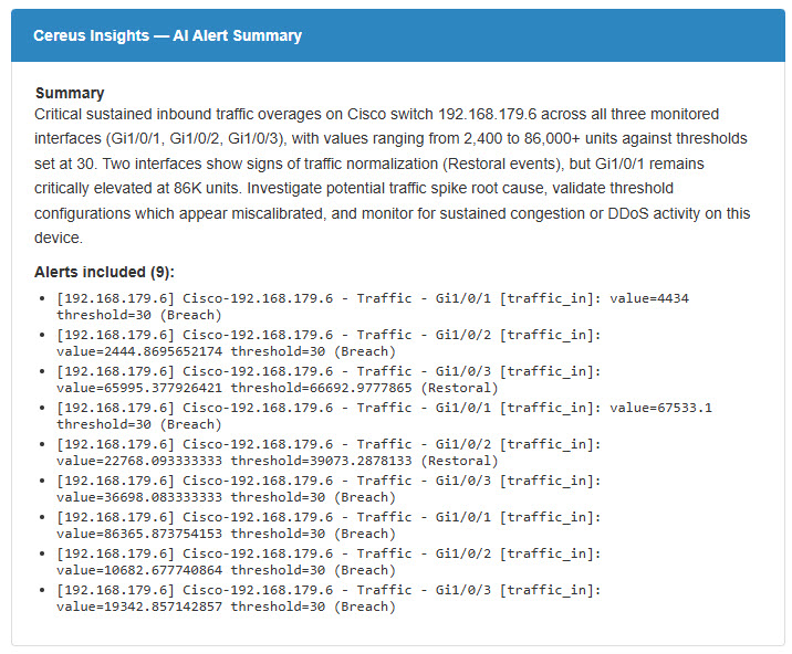 Cereus Insights holds those alerts in a queue for a configurable window (default 5 minutes), then sends the entire batch to the Claude API. The result is a single plain-English summary that identifies the affected devices, the likely root cause pattern, and which alerts are probably correlated.
